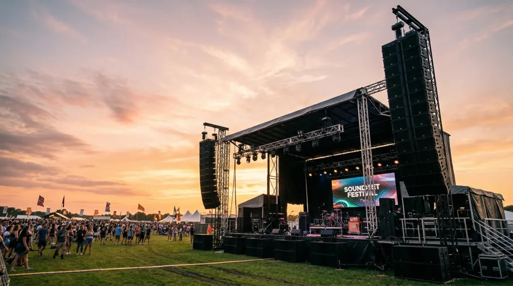 To wartości orientacyjne — wiele zależy od ukształtowania terenu, odległości od widowni i charakteru wydarzenia. Dlatego zawsze rekomendujemy konsultację z inżynierem dźwięku przed wyborem systemu.